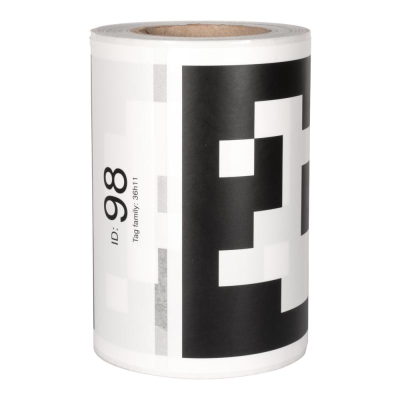 Roll of 100 different AprilTags (Tag36h11) stickers, 100×130 mm (targets 90×90 mm), numbered 00–99. Made from PVC film, moisture-resistant, matte surface for best detection. Used as control points in photogrammetry, robotics, AR, and computer vision. Easy to attach/remove, works on porous surfaces, no residue. Compatible with DotProduct, ROS, C/Java/iOS/Python/Matlab/Simulink, ViSP. Applications: architecture, construction, heritage, energy, robotics, AR, photogrammetry, autonomous driving.