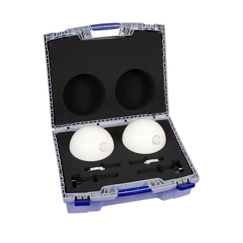 Set of 2 XXL reference spheres Ø200 mm with accessories, designed for long-range scanning. Plastic hollow spheres with reflective surface ensure excellent visibility. Includes female thread M8/20 mm and strong detachable magnet bases, optionally exchangeable for prism pole adapters. Case with foam insert (575×470×270 mm) for safe transport and storage of spheres and accessories. Applications: large-scale surveying, site planning, construction, industrial plants, energy, mining, forensics. Compatible with FARO Focus (Premium, Core, S, M series), Trimble X7/TX5, Leica RTC360, BLK360, ScanStation P-series, Z+F IMAGER, GeoSLAM ZEB series, Surphaser, Artec Ray, Teledyne Polaris, Riegl (on request). Delivery content: 2 XXL spheres, 2 magnet bases, 1 case; optional tripod and prism adapters.