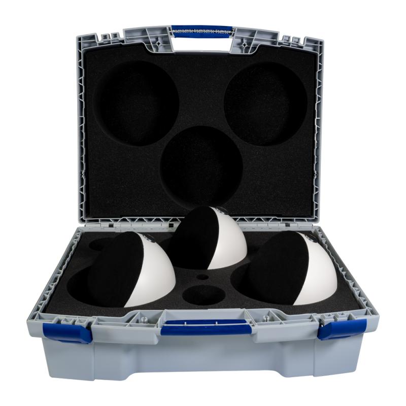 Set of 3 robust 200 mm reference spheres for Deutsche Bahn fixed point signaling, supplied in a plastic case with inlay. Weatherproof cut surface (2.5 cm offset from center) ensures optimal scanner detection. Compatible with Deutsche Bahn rail adapter (030-12661) and intermediate adapters. Can be combined with Flexi and Basic full spheres. Compatible with FARO Focus (all series), Trimble X7/TX5/TX8, Leica RTC360, BLK360, ScanStation P-series, Z+F IMAGER, GeoSLAM, Surphaser, Artec Ray, Teledyne Polaris, Riegl (on request). Delivery content: 3 spheres + 3 magnets + 1 plastic case with inlay.