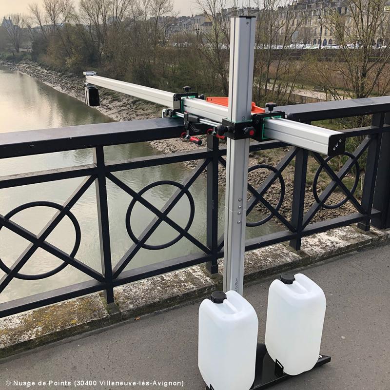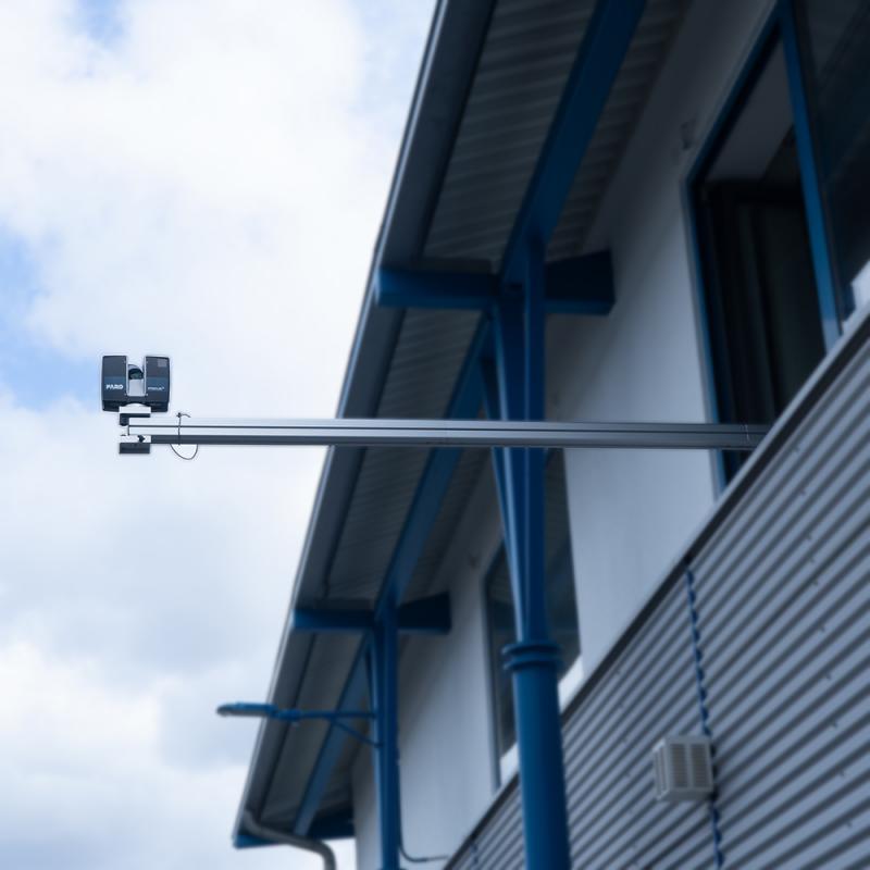 Professional tripod for horizontal facade scanning. Equipped with horizontal arm (2 adapters for upright and overhead scanning), supports secure scanning of facades, windows, roofscapes, elevator shafts, bridges. Made of aluminum and steel, stable with minimal vibrations. Specs: load 6 kg, max distance to facade 260 cm, working height 18–157 cm, max width of window/parapet 22 cm. Delivery: transport box with rollers, base, water cans, vertical extrusion, horizontal arm, window frame bracket, safety adapter, screws, tools, manual. Compatible with FARO Focus (Premium, Core, S/M, X series), Trimble X7, Leica RTC360, Z+F 5016.