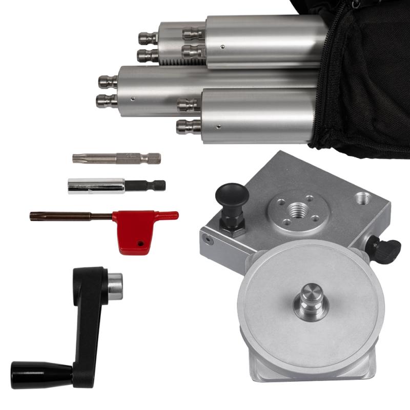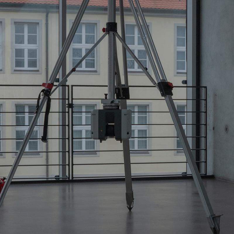 Flexible 2-way telescope tripod developed in Germany, designed for Leica RTC360 laser scanner. Enables scanning up to 4.0 m height or 4.5 m below ground (manhole scanning). Features 5/8" thread, crank drive, anti-twist geared column, spirit level, extension rods, and overhead adapter. Includes robust case and accessories for stable and safe use.