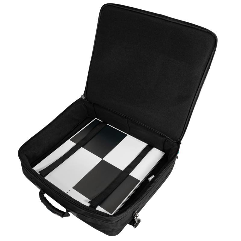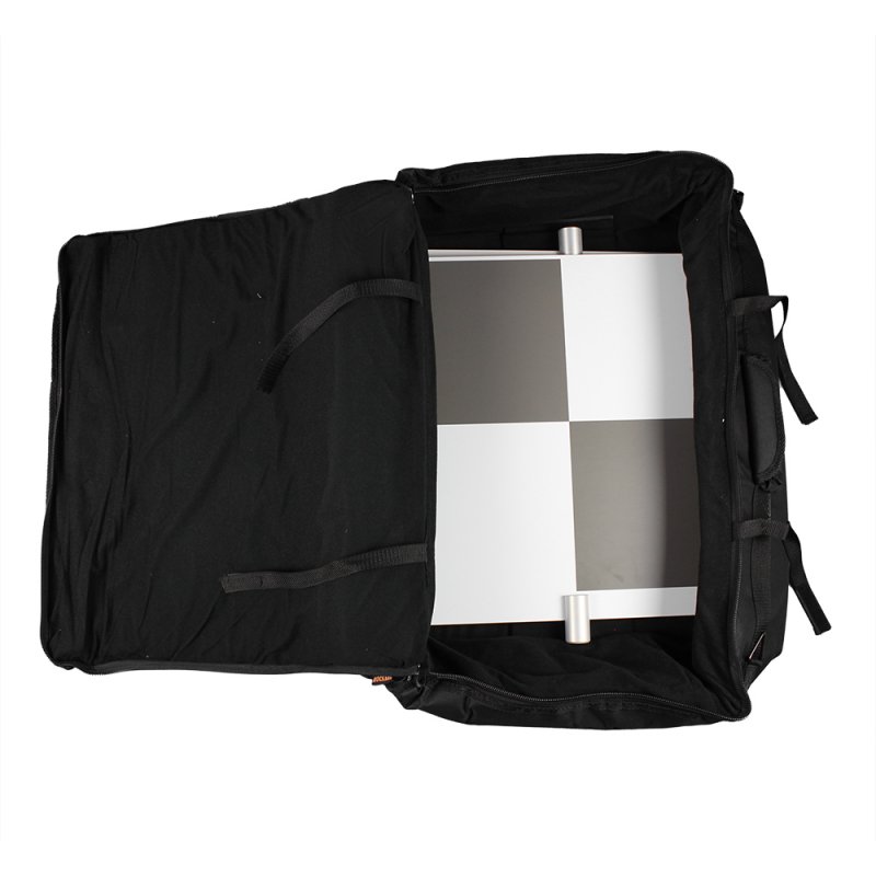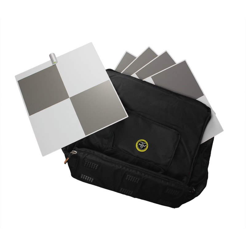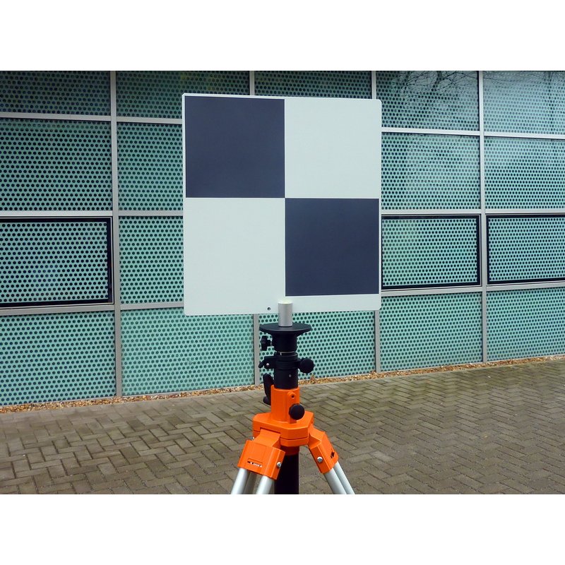 Set of 5 large checkerboard targets (45×42 cm plate, 41×41 cm pattern) with padded waterproof transport bag. Torsion-stiff composite aluminum plates, lightweight, weather-resistant, integrated circular level. Long-distance visibility up to 45 m. Compatible with Leica RTC360, BLK360, ScanStation P-series, FARO Focus (all series), Trimble TX5/TX8/X7, Teledyne Polaris.