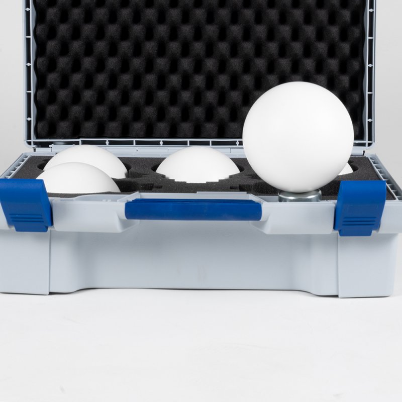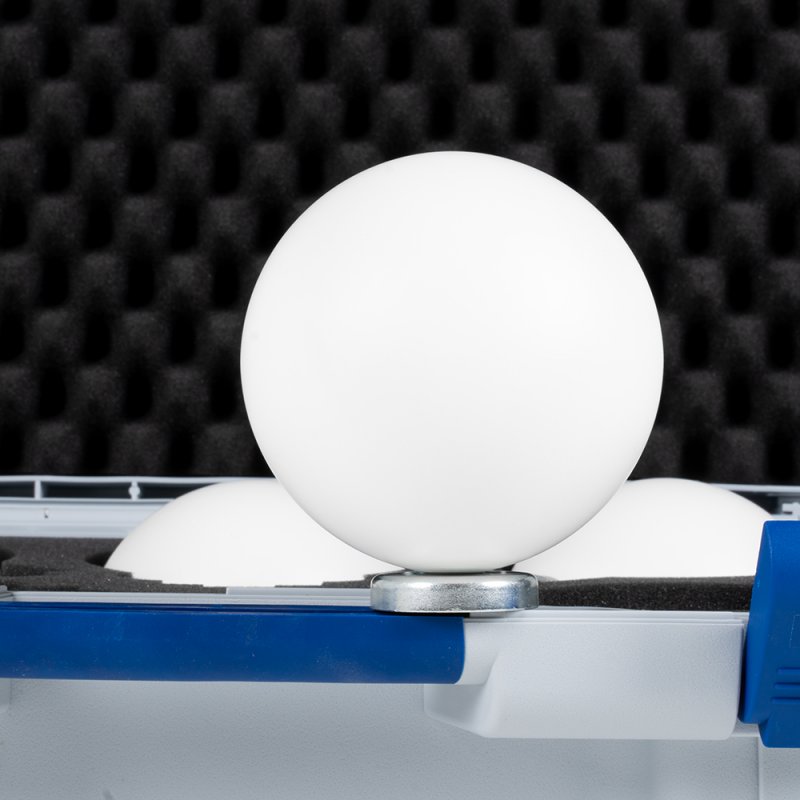 Set of 5 compact 100 mm reference spheres with magnetic bases for short-range laser scanning (up to 10 m at ¼ resolution). Lightweight plastic spheres with reflective coating, M8 female thread for adapter use. Delivered in a robust case (390×310×140 mm) with foam inlay. Ideal for small scanning areas, registration of scans, combining terrestrial and handheld 3D scanner data. Applications: architecture, construction, plant engineering, aircraft/shipbuilding, forensics. Delivery content: 5 spheres, 5 magnetic bases, 1 case.
