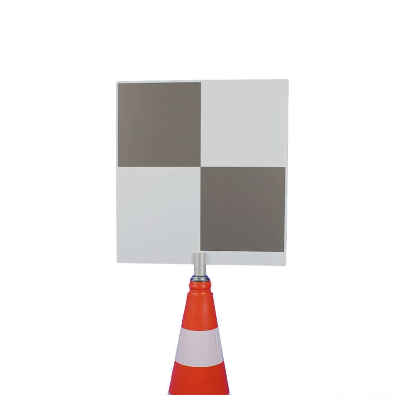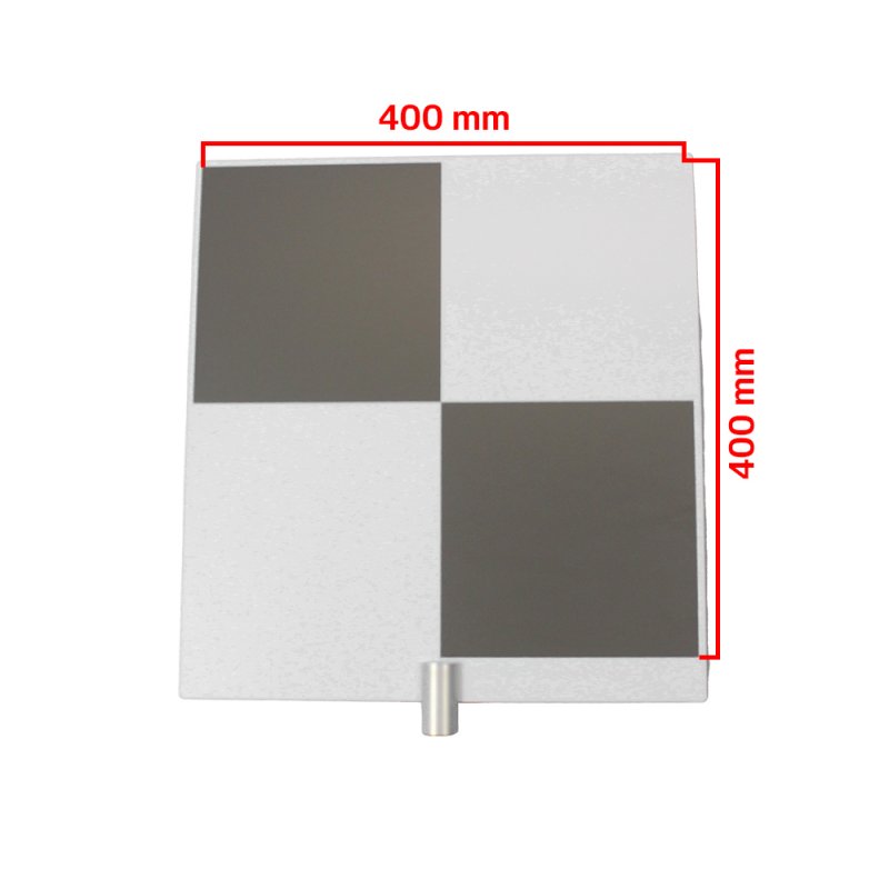 Universal large checkerboard target (45×42 cm) for long-distance laser scanning and surveying, compatible with Leica, FARO, Trimble, Teledyne, and other scanners. Weather-resistant, lightweight, with integrated circular level and tripod mounting options.