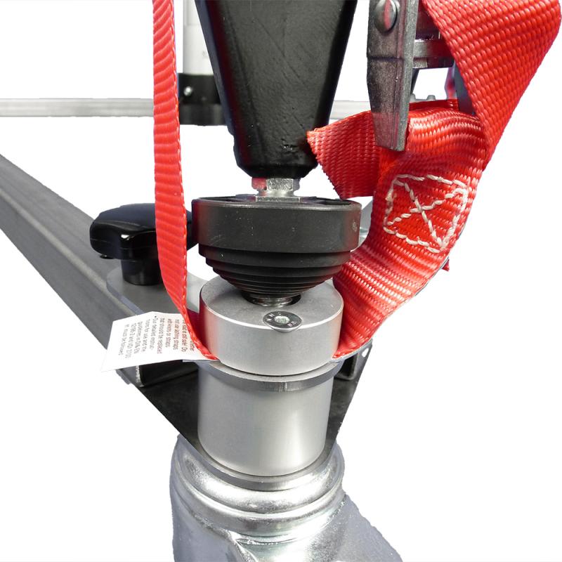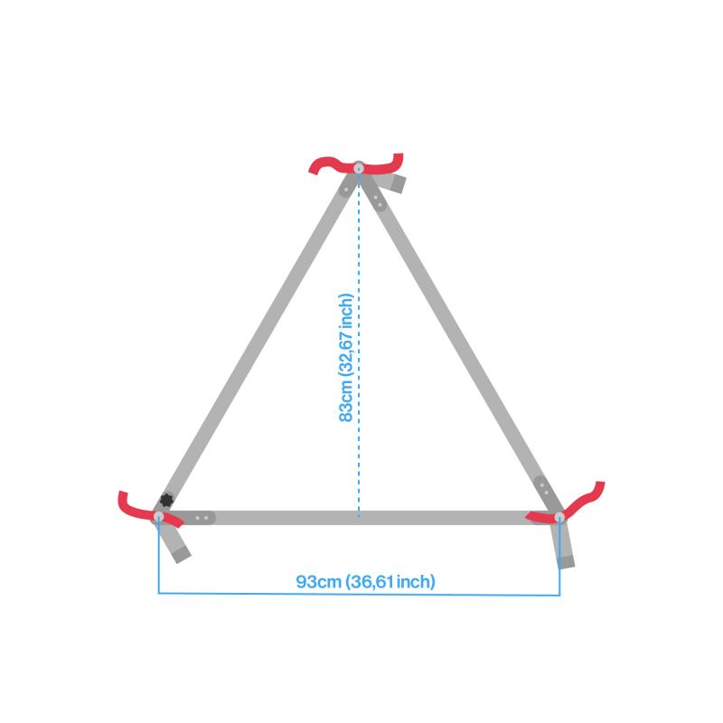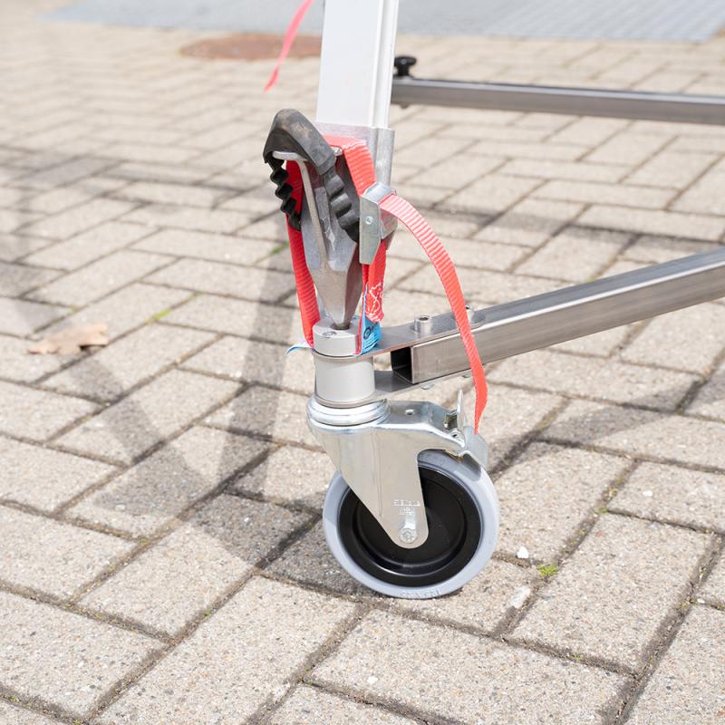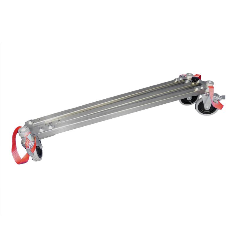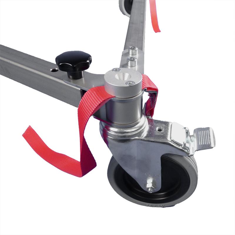 Heavy-duty stainless-steel tripod dolly for transporting laser scanner tripods between scan positions. Triangular form (930 mm side length) designed for overhead and shaft scanning. Supports up to 50 kg load, collapsible design for easy transport, with lockable 125 mm wheels ensuring stable footing during scanning. Universal compatibility with carbon and aluminium tripods.