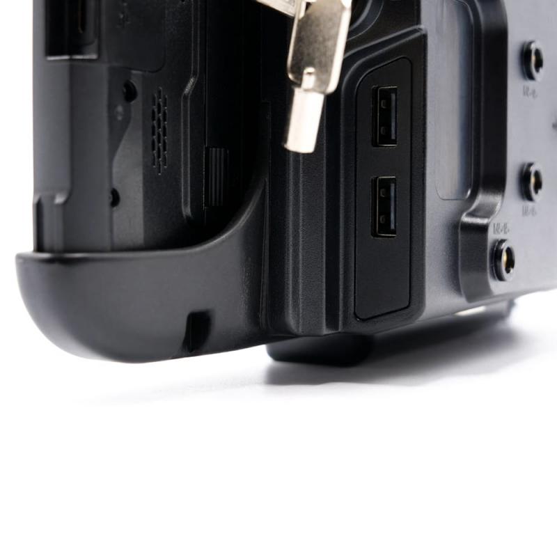 The Algiz RT8 Vehicle Dock keeps the device steady in your vehicle and offers multiple connectivity options: VGA, RS-232, Ethernet, 2× USB-A ports, and power input 12-19V DC. Includes key-lockable dock, VESA 75×75 mm mount, compatible with the standard RT8 hand-strap.