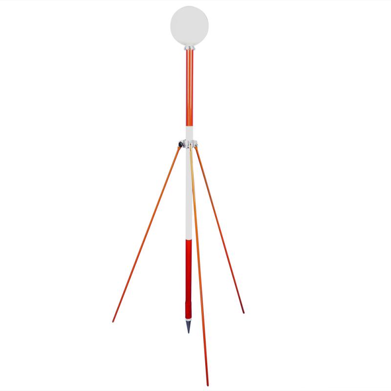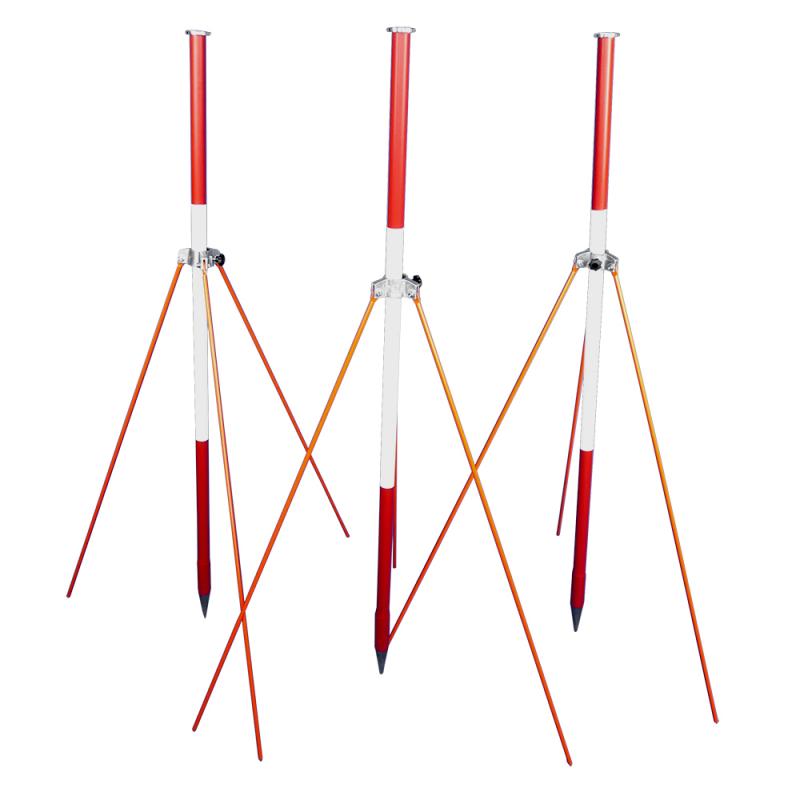 Set of 3 wooden ranging poles (1.3 m) with strut supports (1 m). Each pole has a metal disc for magnet base spheres, steel tip for ground placement, and high-visibility paint. Strut supports include screw clamps for stability. Ideal for elevating reference spheres indoors/outdoors where ground-level spheres may be overlooked.