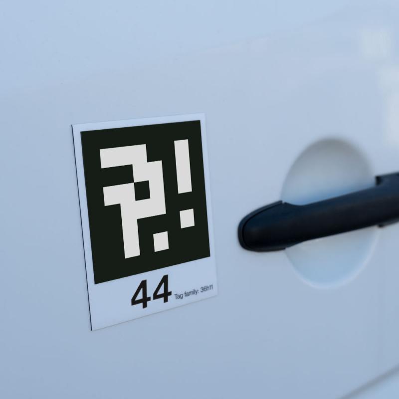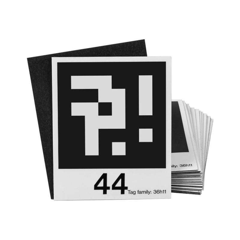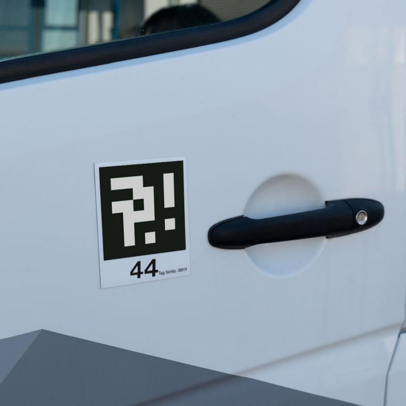 Set of 20 AprilTags (Tag36h11), size 15×15 cm, on flexible magnetic plates (16×20 cm, 1.2 mm thick). Extra light (102 g each), weather resistant, numbered 0–19. Attach easily to metal surfaces (steel columns, electric/fire boxes, trailers, doors). Applications: photogrammetry, robotics, AR, computer vision, autonomous driving. Compatible with DotProduct, ROS, C/Java/iOS/Python/Matlab/Simulink, ViSP. Delivery: 20 tags.