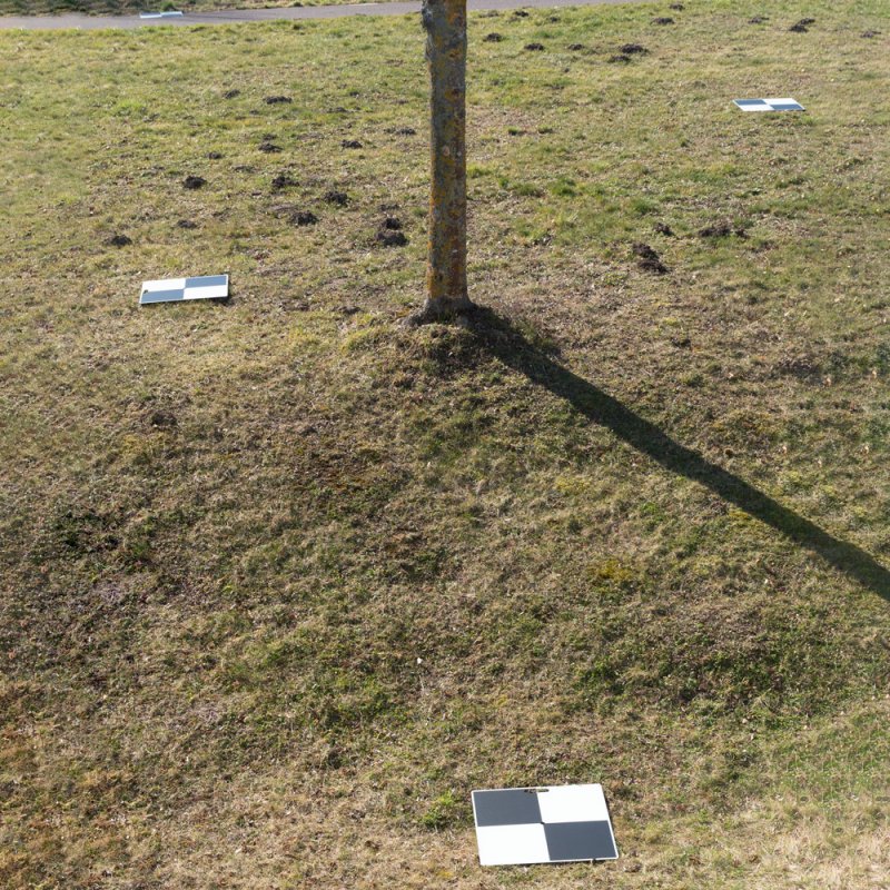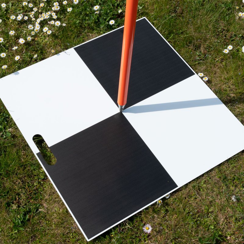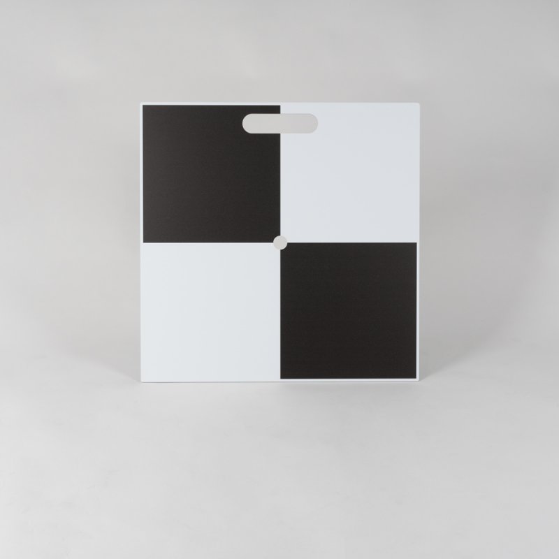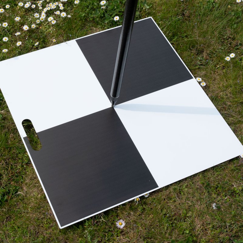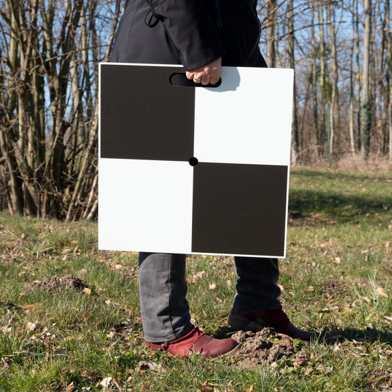 Robust reusable aluminum composite ground control points (50×50 cm, checkerboard 49×49 cm, 3 mm thick). Plates feature central hole (Ø10 mm) for fixed-point positioning and practical cut-out handle for easy transport. Each weighs 0.8 kg, no anchoring required. Applications: UAV photogrammetry, LiDAR, terrestrial survey, construction, mining, archaeology, forensics, urban planning. Delivery content: 10 GCP plates.