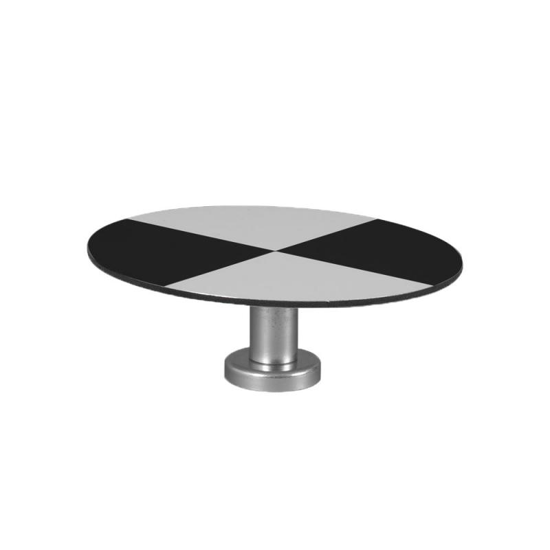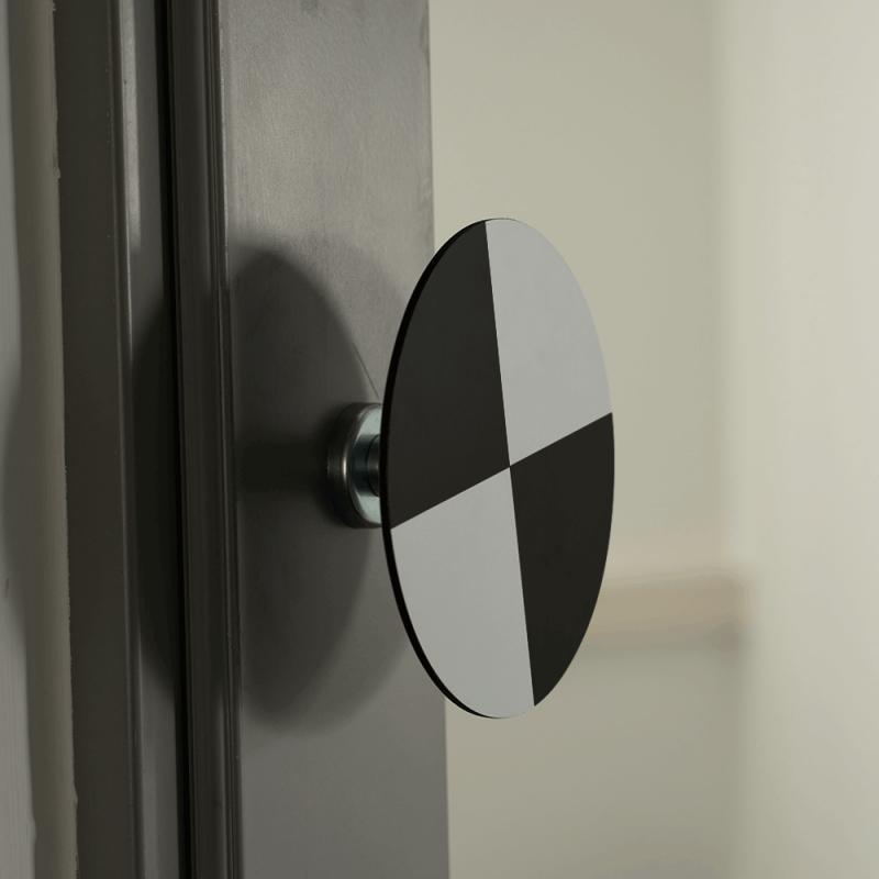 Durable round checkerboard target with a 6 cm diameter and magnetic connection. Ideal for use in 3D laser scanning, surveying, and creating reference points in both outdoor and indoor environments.